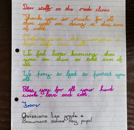 Thanks Christiana Lee a Beaumont learner for the lovely letter written from your heart for the hospital personnel.