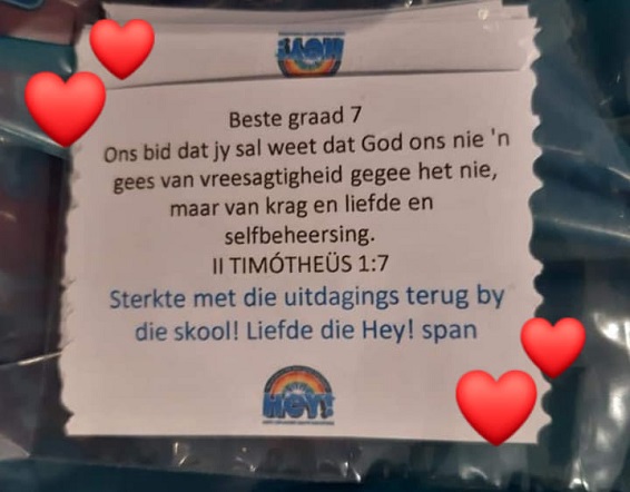 Lockdown means no school but also not being able to get porridge early and a meal during breaktime which the schools with feeding schemes provide to many of the 5000 children whom Hey! minister to during the school term. An initiative was started by us to get donations to enable food parcels to be provided to needy families in some of these schools. The idea to give physical bread so to speak, where we normally share Jesus “the Bread of Life” John 6:48 is so exciting. The WCED provides some help which is amazing but the need out there is massive!
