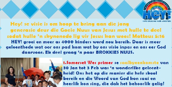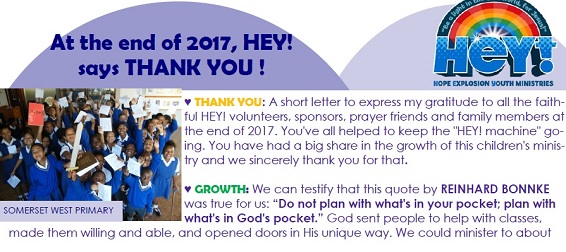 Die briefie aangeheg is om dankie te sê vir die jaar se ondersteuning, gebede, insette wat alles bygedra het tot ‘n suksesvolle HEY!jaar. Ons is so dankbaar teenoor ons Hemelse Vader vir elke kind wie bereik kon word deur die HEY! bediening asook elkeen wie deur HEY! HELP! gehelp kon word. Dit was ‘n spesiale, opwindende en propvol jaar!
